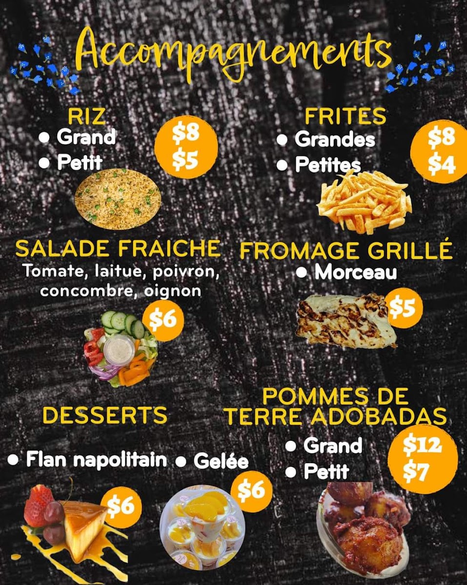 Alongside the fantastic main dishes, La Maison du Grand Poulet offers an array of sides and delectable desserts. Indulge in their rich, velvety Flan Napolitain or a playful Mosaïque de Gélatine, both priced at just CA$6.00—perfect for satisfying your sweet tooth after a savory feast.