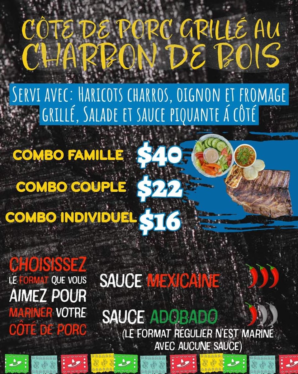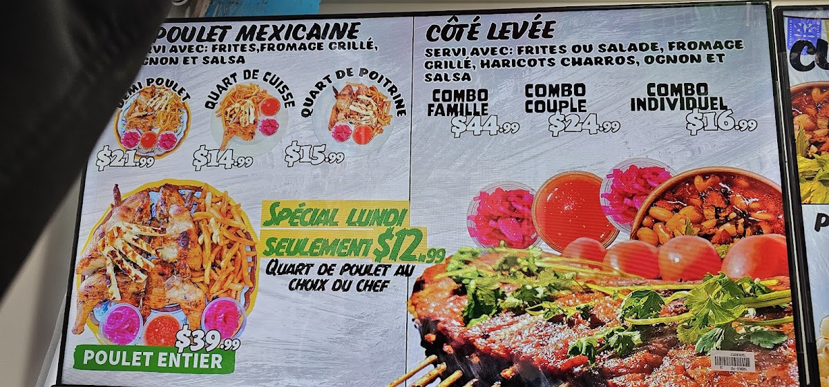 One of the standout features of this restaurant is their POULET MEXICAIN, which comes grilled over charcoal, perfectly tender and infused with smoky flavors. The dish is accompanied by creamy melted cheese, tangy pickled onions, and a choice of either spicy or sweet salsa, creating a delightful medley of tastes. You can savor a whole chicken for just CA$39.99 or opt for a demipoulet at CA$21.99. Don't miss the quarter cuts available, either—choose from breast or thigh, served with crispy fries or a fresh salad to complement the meal.
